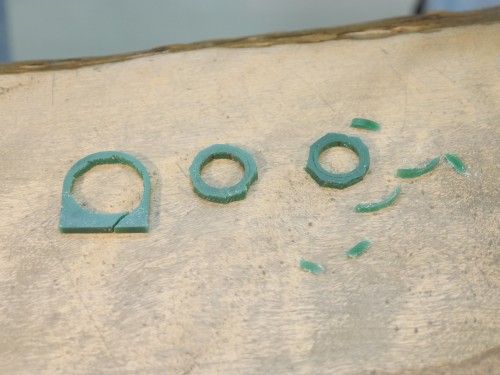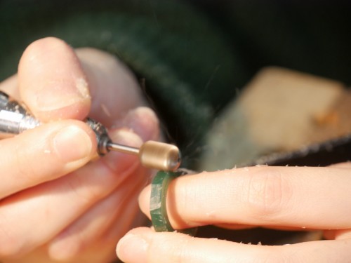 手に持っている緑色の塊がリングの原型になります。