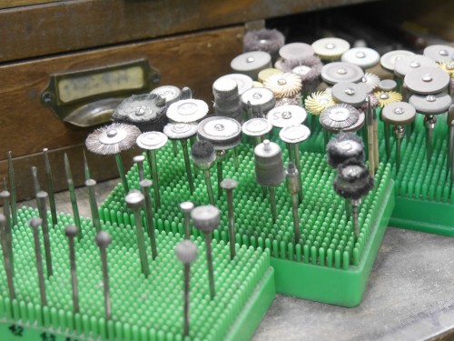 金属を削るカッター、仕上げに使うペーパーや、研磨剤を付けて磨くポイントなどなど。