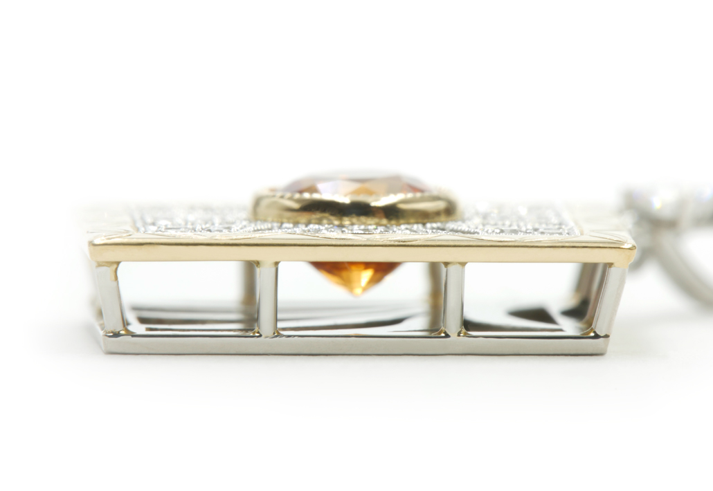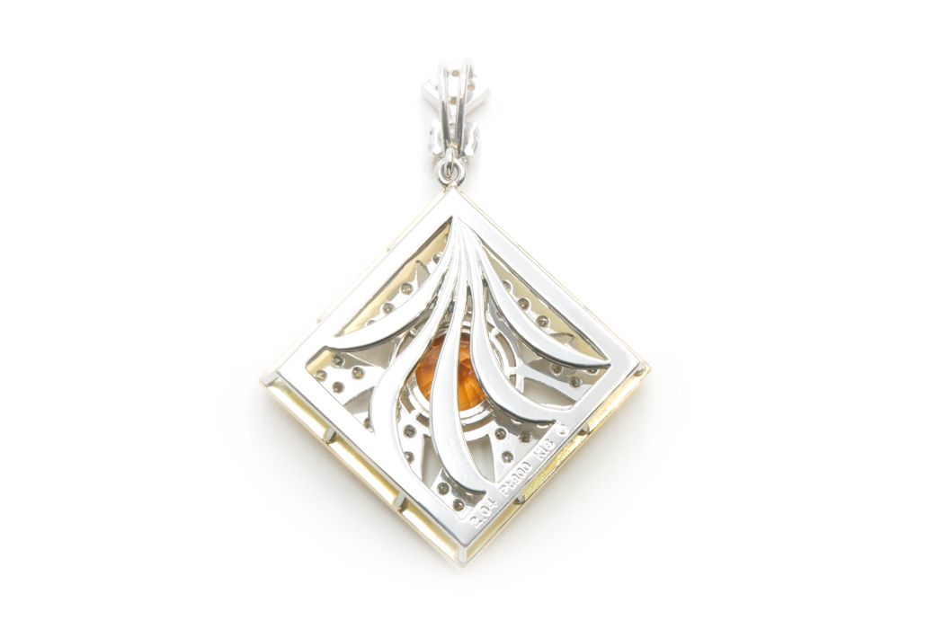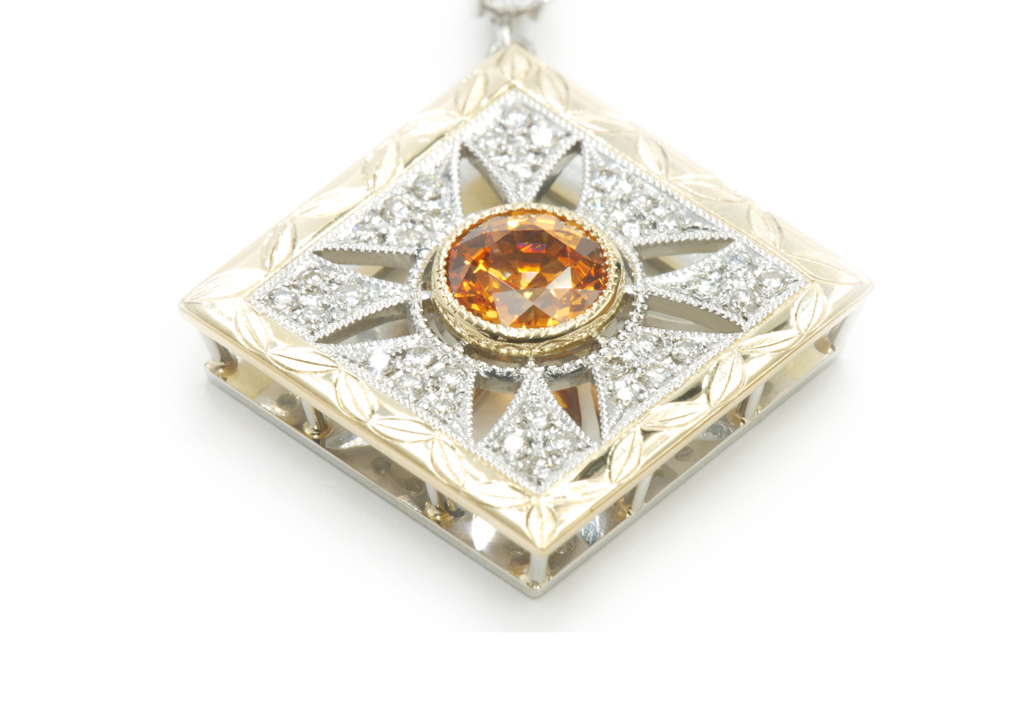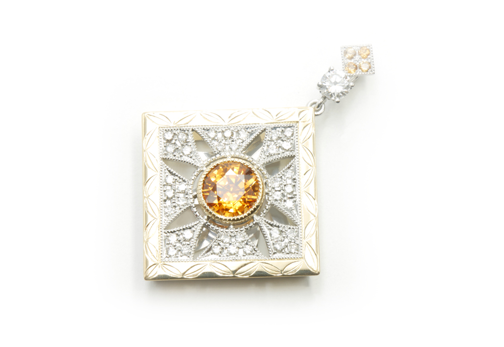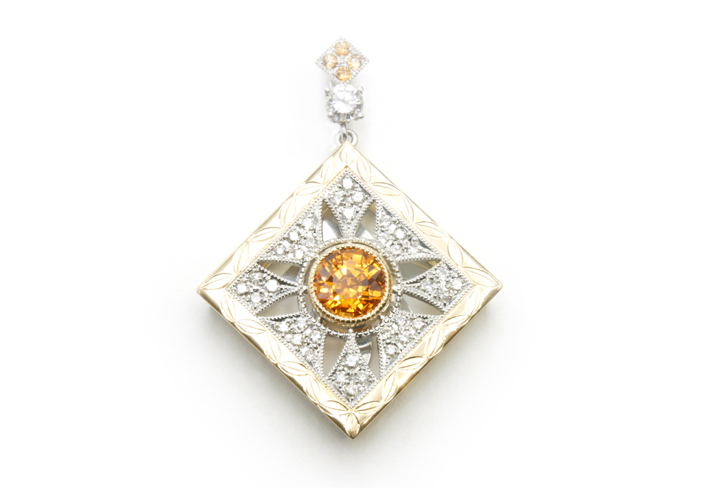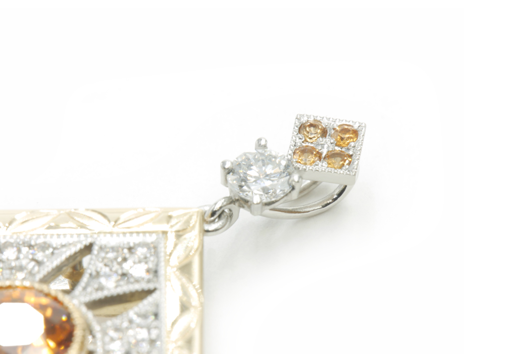 さらにバチカン部分には、中央の宝石と同色のスペサルティンガーネットを施し、全体の統一感や華やかさをより一層引き立てました。