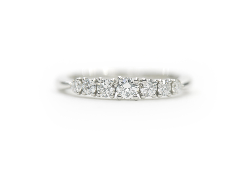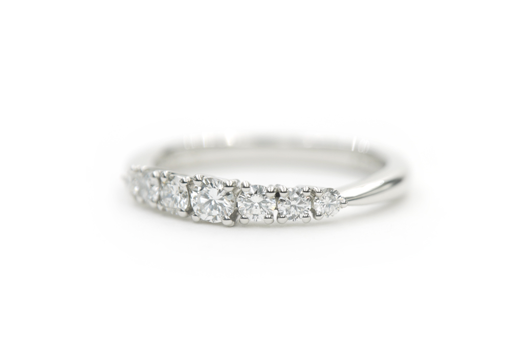 ストレートラインのリングに、サイズ違いのダイヤモンドが並ぶハーフエタニティに。
